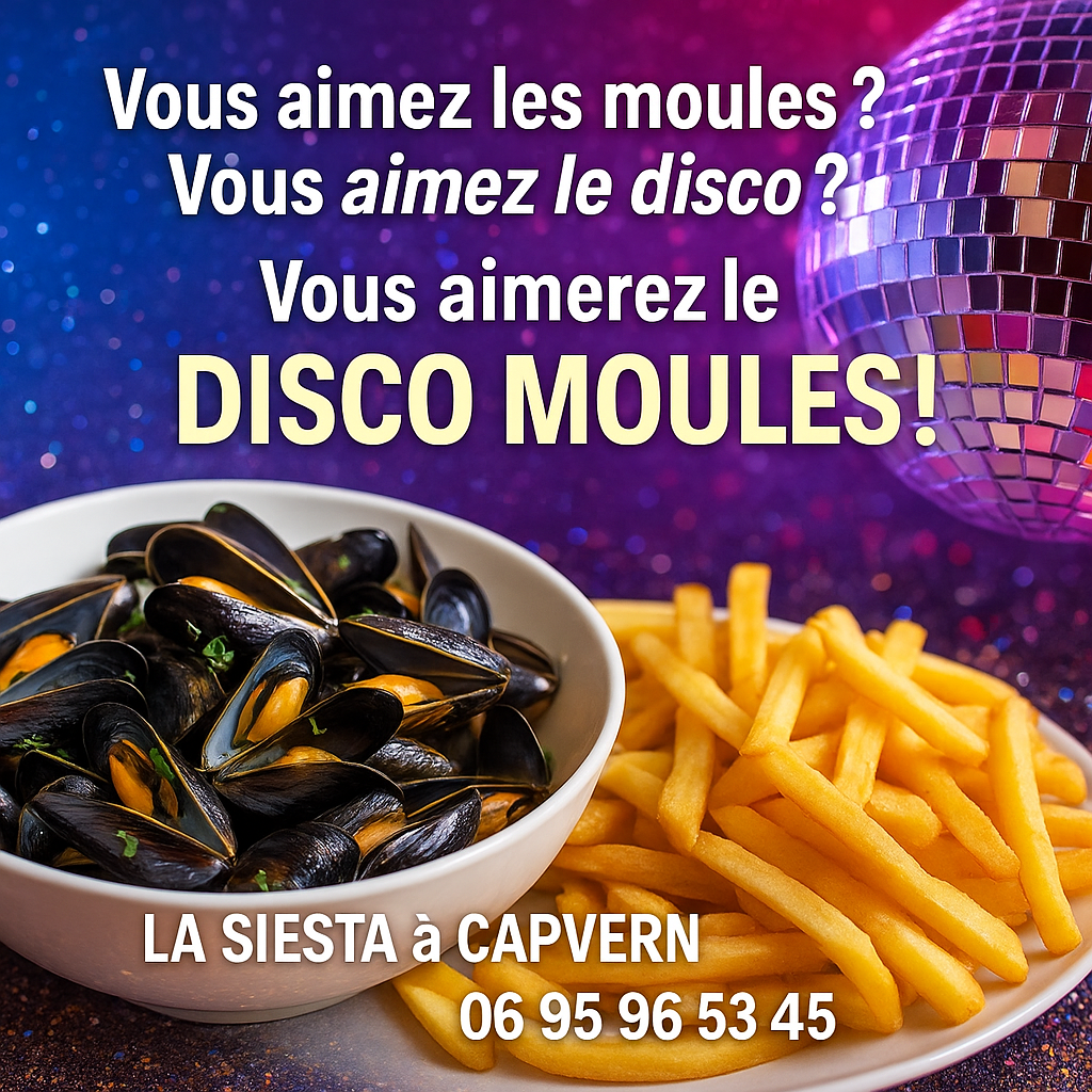 ✨🕺 DISCO MOULES 🥘 Moules + frites 15 € 🍟 (sur résa) 🔹 Vous aimez les moules… 🔹 Vous aimez le D.I.S.C.O… 👉 Alors vous allez adorer le DISCO MOULES ! 🔥 19h Ouverture des portes 🔥 19h30 Repas DISCO 🔥 22h DJette Fanny – Génération 80