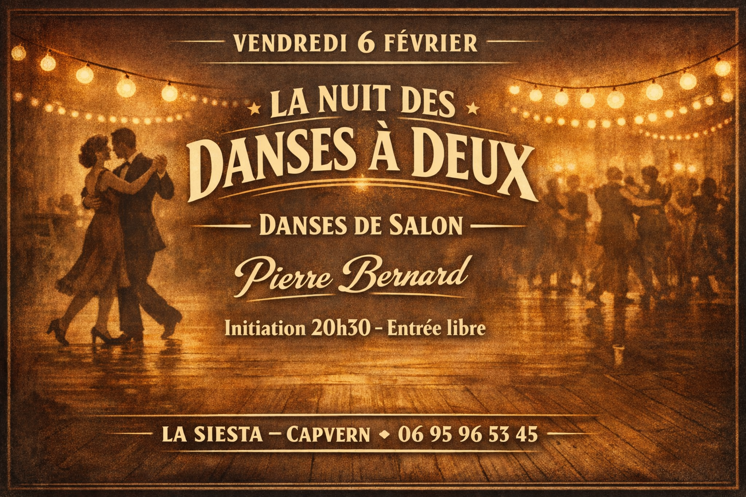 ✨ LA NUIT DES DANSES À DEUX ✨ 🎺 DANSES DE SALON 🎷 Animé par Pierre Bernard 🕢 Initiation gratuite à 20h30 🎶 Soirée toutes danses, ouvert à tous 🍽 Plat du danseur : 15 € 🍷 Bar dès 5 € 🎟 Entrée libre
