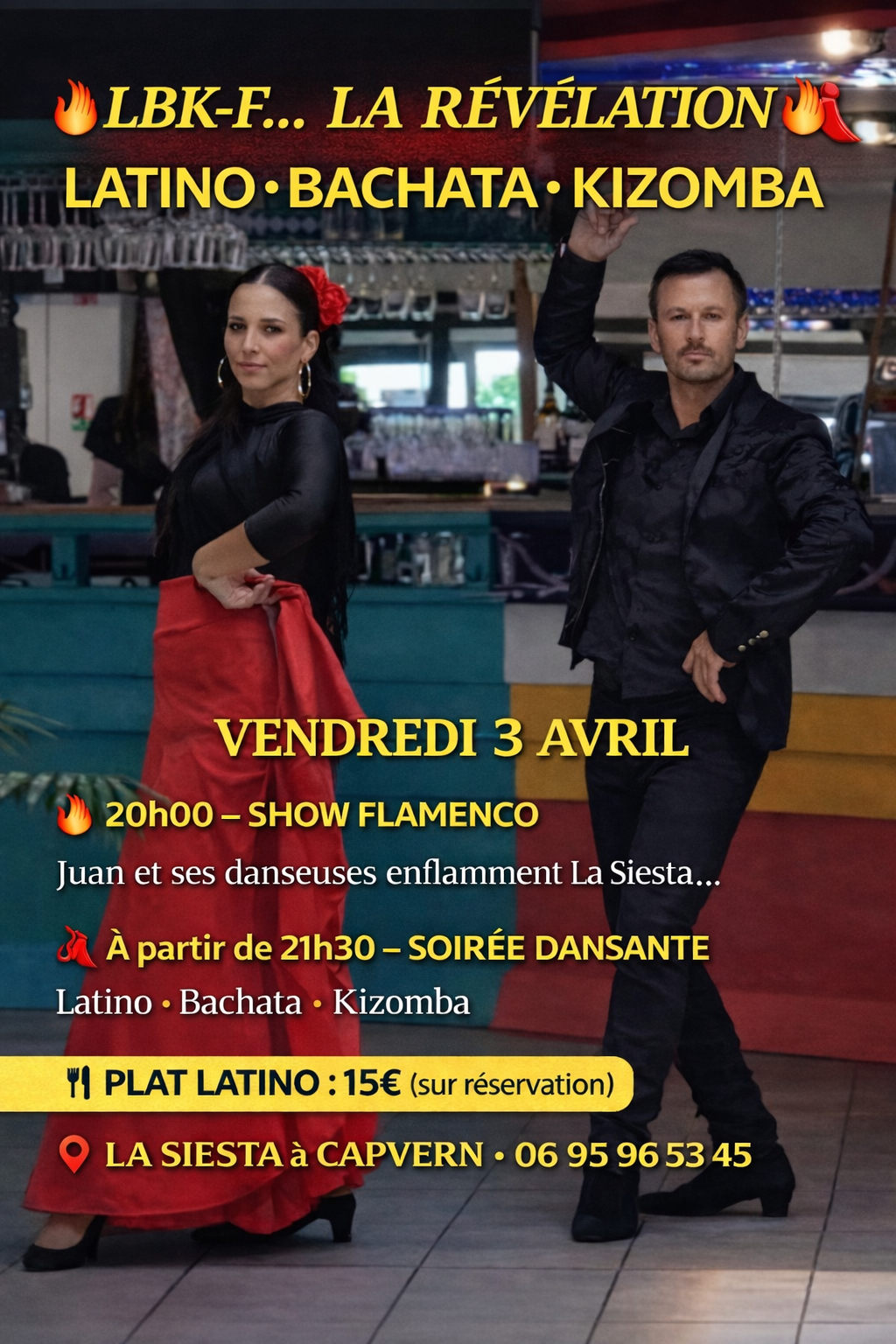 💃🔥 L.B.F… NOUVEAU CONCEPT🔥💃 🤔 Vous vous demandiez ce que signifiait L.B.F… 👉 Il est temps de lever le voile… ✨ L.B.F = LATINO • BACHATA • FLAMENCO ✨ Latino (Salsa & Kizomba incluses) Une toute nouvelle soirée arrive à La Siesta… Plus spectaculaire, plus intense, plus caliente que jamais ! 🔥 💃 AU PROGRAMME 🔥 20h00 – SHOW FLAMENCO Juan et ses danseuses enflamment la scène avec un spectacle vibrant, élégant et puissant… 👉 Une vraie immersion dans l’ambiance andalouse ! 💃 À partir de 21h30 – SOIRÉE DANSANTE Place à la fiesta ! 👉 Latino • Bachata • Kizomba 👉 Une piste chaude, festive et pleine d’énergie comme vous les aimez à La Siesta ! 🍽️ CÔTÉ GOURMAND 🍴 Plat latino : 15€ (sur réservation) 🥓 Ardoise du terroir (comme vous aimez) 👉 Mangez… dansez… faites la fête ! 🎉 L’ESPRIT LA SIESTA Les habitués le savent… 👉 Le vendredi, tout peut arriver… 👉 Et les nouvelles soirées deviennent souvent les meilleures !